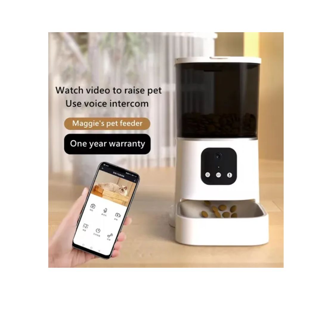 Este alimentador automático te permite programar la ración diaria de tu gato o perro de manera precisa y sin preocupaciones, incluso cuando no estás en casa. Su tolva transparente te ayuda a controlar el nivel de alimento, mientras que el panel táctil digital facilita la configuración de hasta 4 comidas al día.
